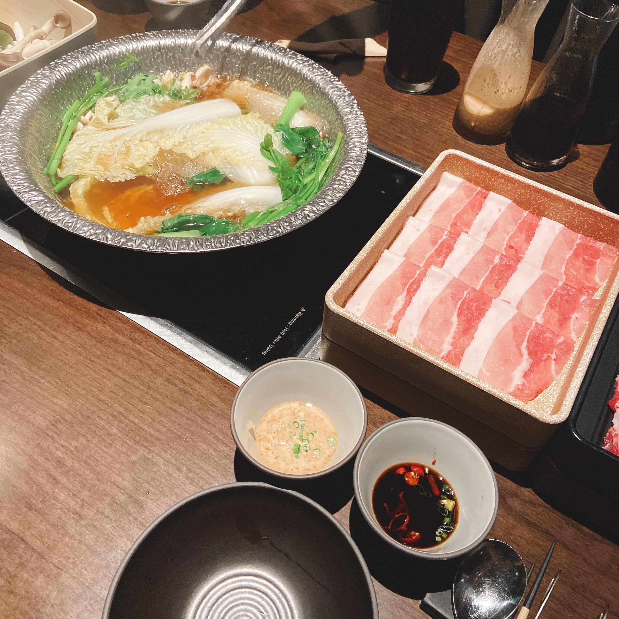 저는 이날 시그니처 코스(성인 58,000원)를 선택했어요. 소고기(부챗살, 알목심) 돼지고기(삼겹살, 목살)가 제공되는데, 전부 미국산이지만 고기의 질이 정말 좋아서 감탄했어요. 잡내 없이 깔끔하고, 육즙도 적절해서 샤브샤브용으로 완벽했어요.