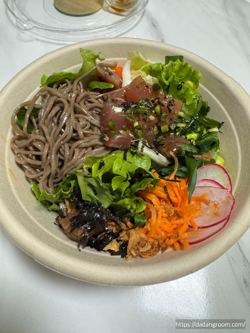 제가 주문한 참치 누들 포케는 오리엔탈 소스를 베이스로 골랐고, 메밀면이 들어 있어 든든하면서도 깔끔한 맛이 매력적이었어요. 재료로는 청미채, 참치, 날치알, 메밀면, 해초, 백김치, 당근피클, 래디시, 풋콩, 어니언 플레이크, 김가루, 쪽파, 검은깨가 푸짐하게 들어 있었는데, 어느 하나 어색한 조합이 없더라고요.
