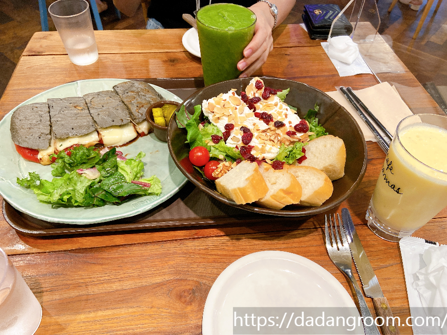 카페마마스의 시그니처 메뉴답게 리코타치즈샐러드는 정말 만족도가 높았어요. 넉넉하게 올려진 리코타치즈는 부드럽고 고소한 맛이 일품이고, 샐러드 채소들은 신선도가 아주 좋아요. 위에 얹어진 건크랜베리와 아몬드 슬라이스가 식감에 재미를 더해주고요.