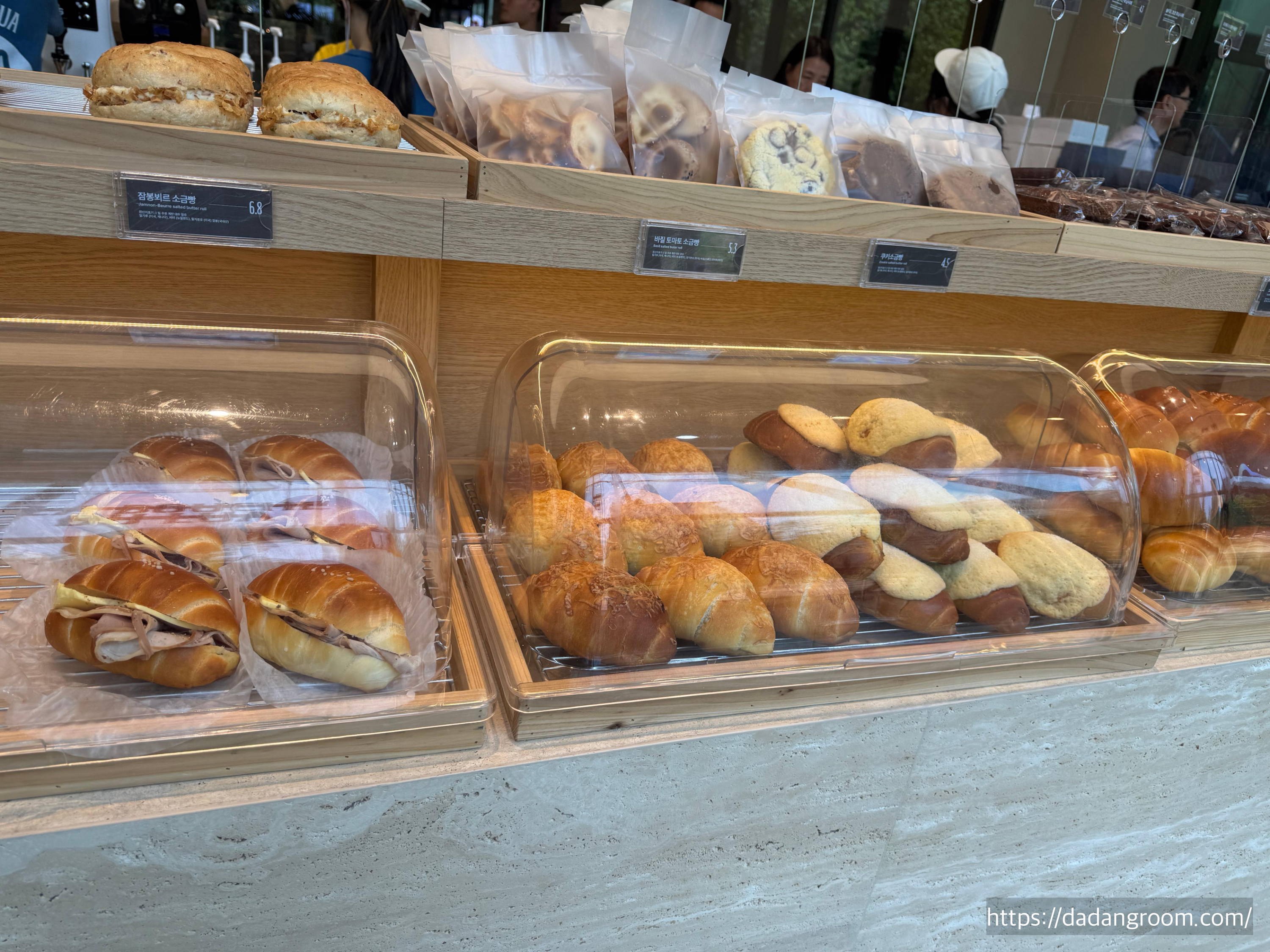 베이커리 종류가 정말 다양하고 비주얼도 예뻐서 진열대 앞에서 한참을 고민하게 돼요.