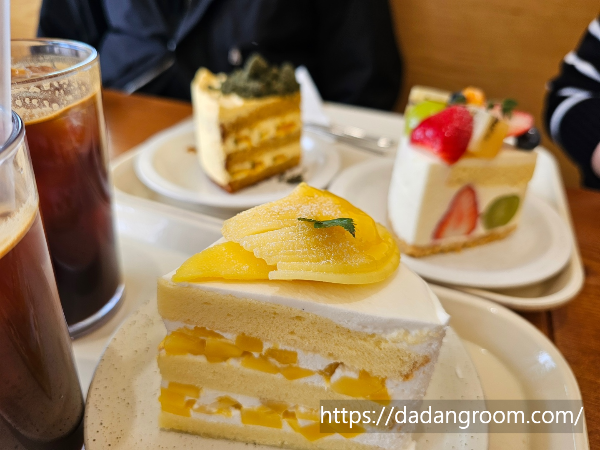 우리는 봄소풍, 망고생크림, 쑥스러운단호박 이렇게 서로 다른 종류의 케이크를 조르고, 아메리카노 3잔을 주문했어요. 점심시간대 조금 지나기 전에 도착했는데도 이미 케이크 진열대가 많이 비어 있었고, 인기 많은 메뉴는 빠르게 품절되는 듯했어요. 그래서 마음에 드는 케이크를 먹으려면 오픈 시간에 맞춰 가는게 확실히 유리할 것 같아요.