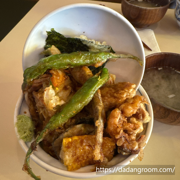 처음 방문이었기 때문에 제일 기본이자 대표 메뉴인 다호텐동을 주문했어요. 이 메뉴 하나로 새우부터 야채, 고기, 해산물까지 다양한 튀김을 한 번에 맛볼 수 있어서 첫 방문에 제격이었어요.