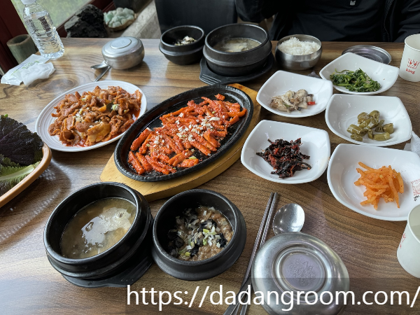 저희는 제육볶음 + 더덕구이 3인 세트를 주문했어요. 밥상 위로 된장찌개, 우렁된장, 더덕구이, 제육볶음, 다양한 나물반찬이 예쁘게 한상 차려져서 나오는데, 보기만 해도 든든하고 먹기 전부터 기분 좋아졌어요.