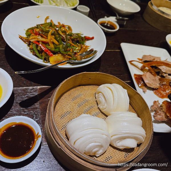 북경오리 요리는 요리사분께서 직접 테이블에 와서 서빙해주시는 방식이었는데, 이 부분도 고급 레스토랑 같은 세심한 배려가 느껴졌어요. 고급스러운 분위기에서 정성껏 준비된 음식을 천천히 음미할 수 있는 시간이 참 감사했어요.