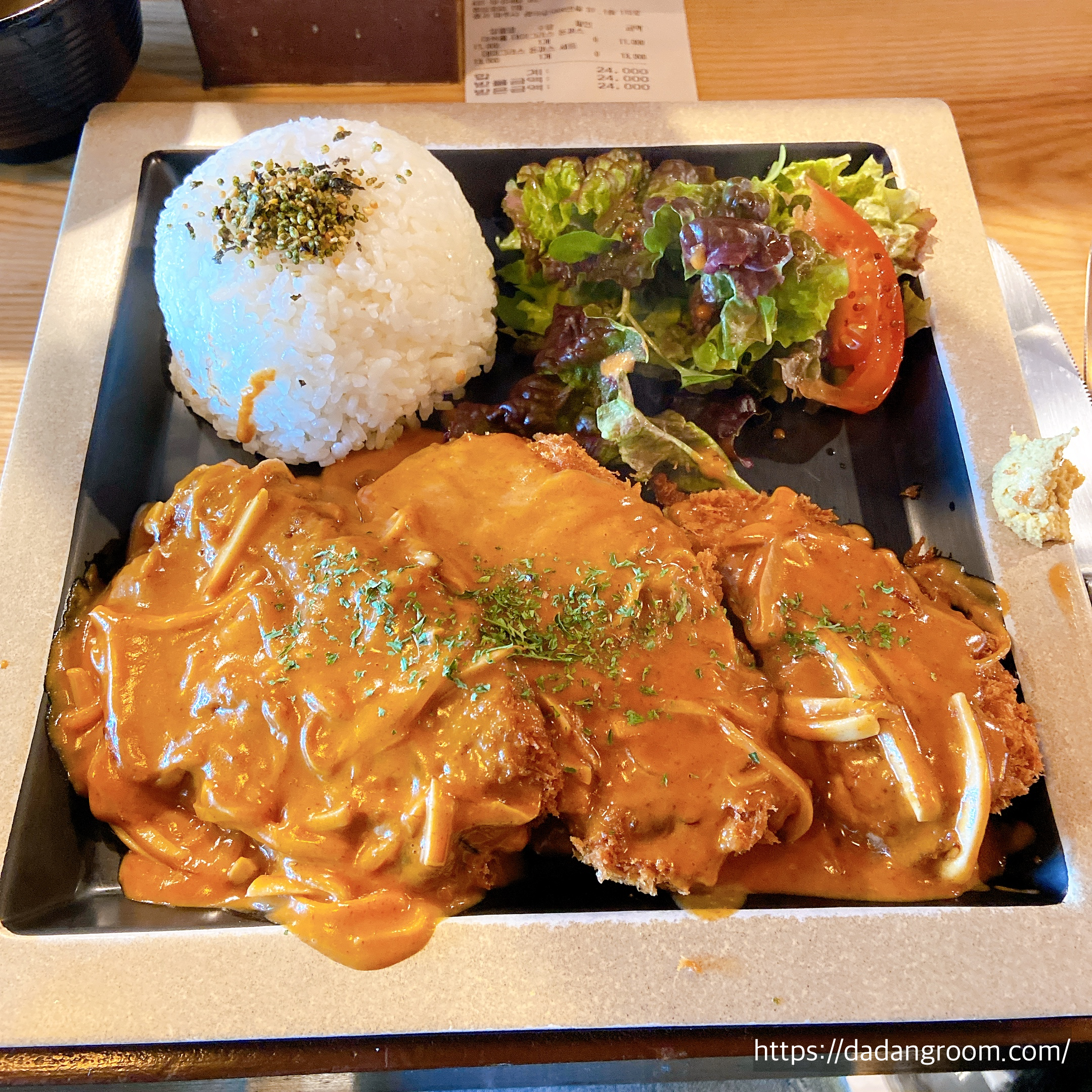 - 점보 데미그라스 돈까스 (23,000원) : 돈까스 5장 + 샐러드 + 밥 + 수란